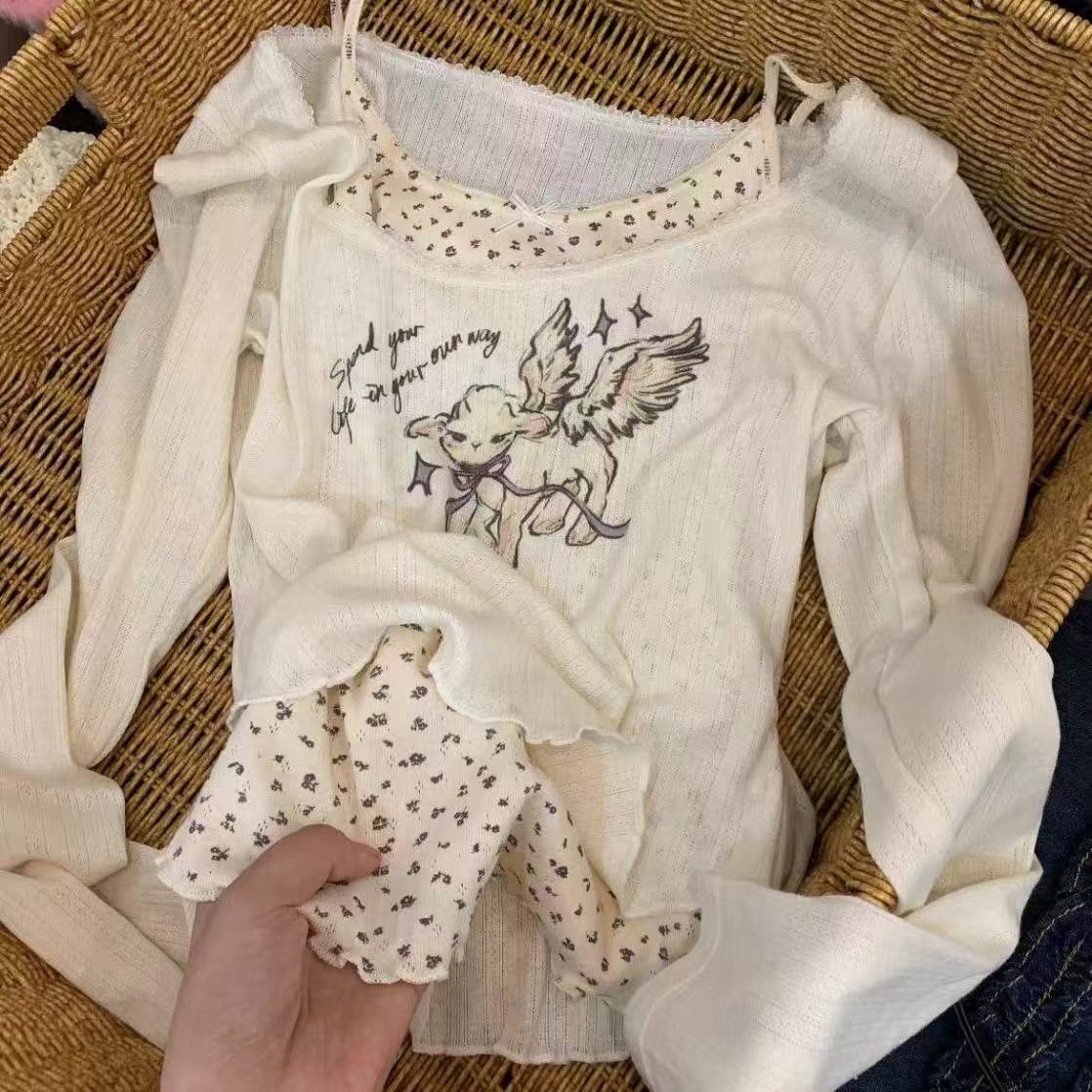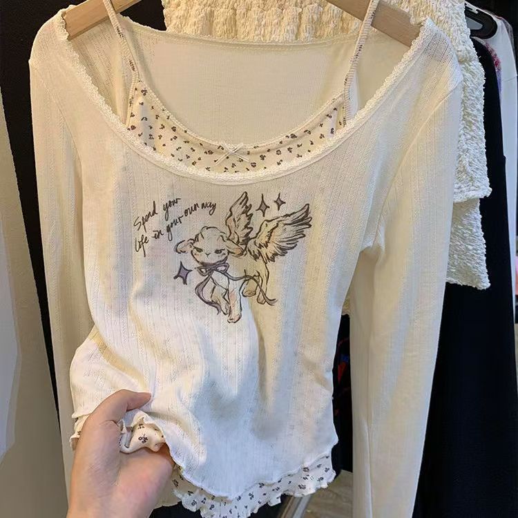 Korean-style long-sleeved T-shirt for women with lace trim.